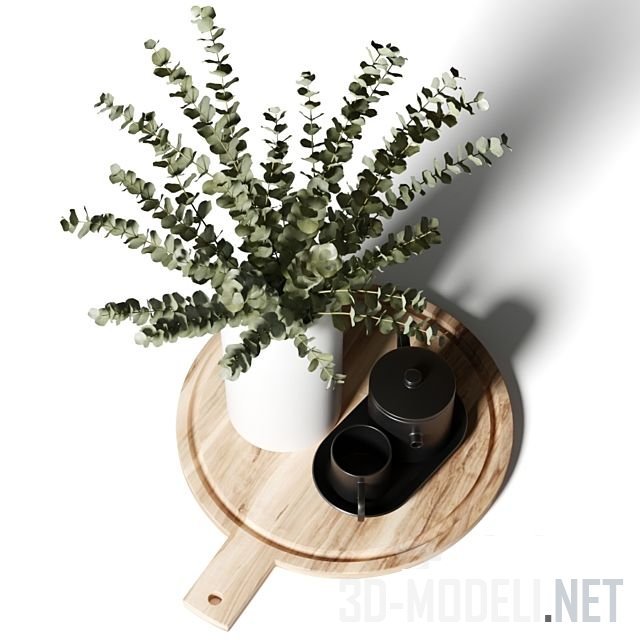 Функциональное украшения для интерьера кухни. На круглой деревянной доске стоит белая ваза с букетом из веток эвкалипта. Черного цвета чайник и чашки вносят красивый контраст.