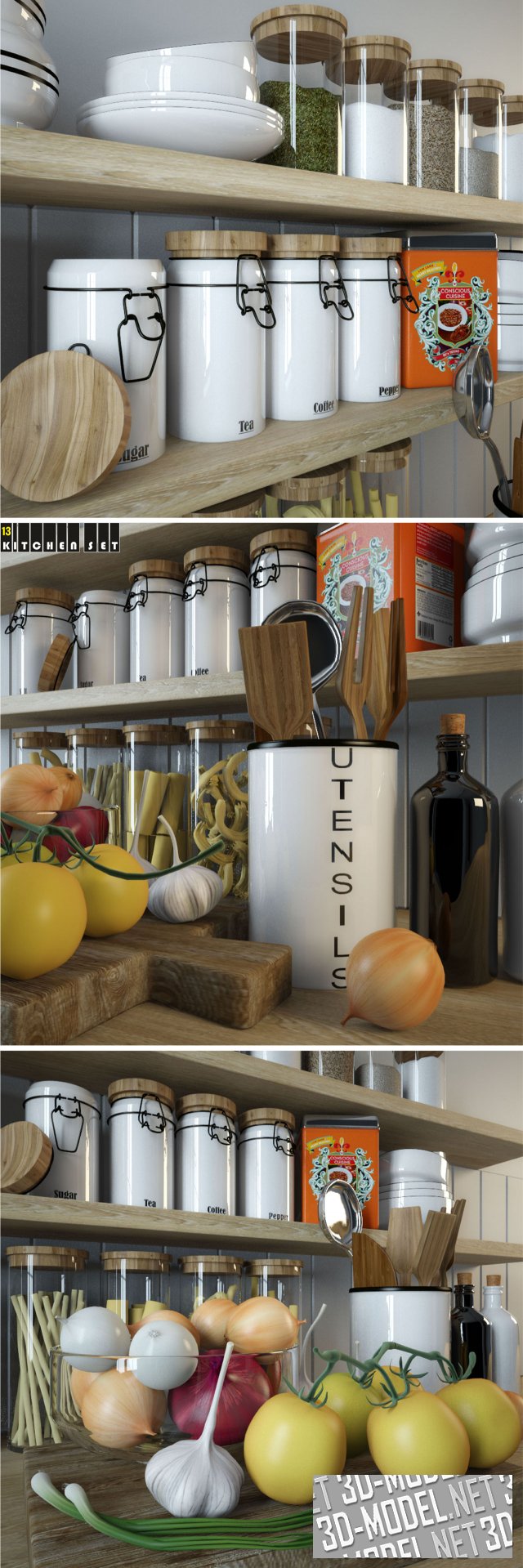 Баночки для сыпучих продуктов с деревянными крышками, продукты и посуда на столе и двух деревянных полках. На переднем плане композиции размещена рустикальная деревянная разделочная доска с веткой желтых томатов, чеснок, лук нескольких сортов и цилиндрическая керамическая емкость с деревянными ложками, вилками и лопатками на длинных ручках. За ними: черная и белая керамические бутылки с растительными маслами и пять прозрачных стеклянных цилиндрических емкостей под деревянными крышками. В емкостях: макаронные изделия разных видов. На деревянных полках: керамические миски трех видов, белые и прозрачные цилиндрические емкости для сыпучих продуктов и жестяная квадратная банка с крышкой. В прозрачных банках просматриваются различные крупы.