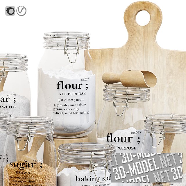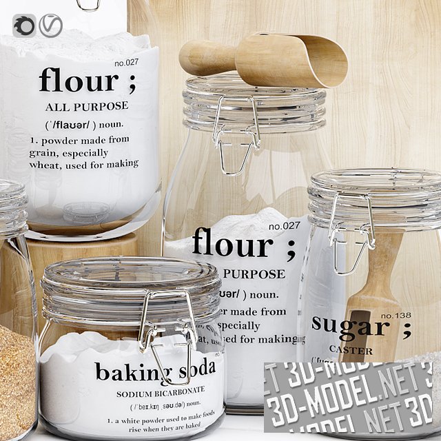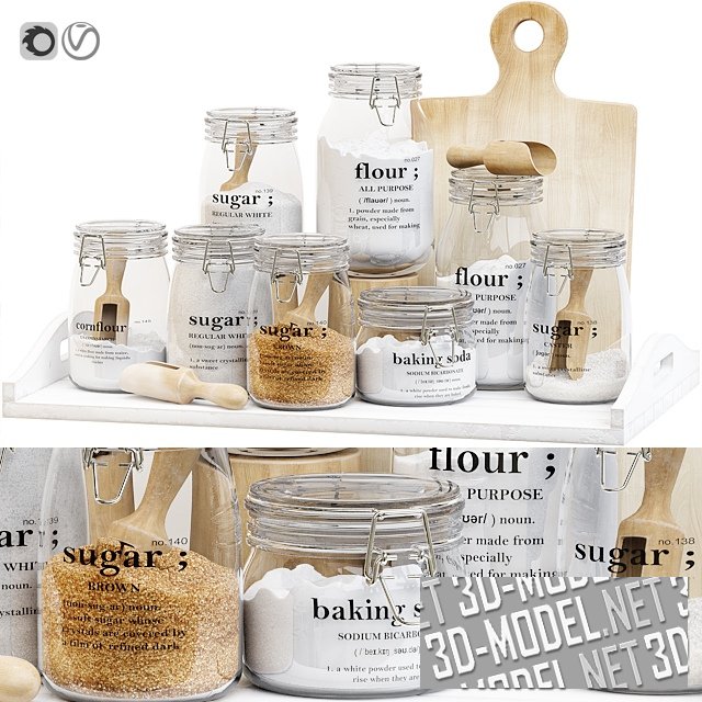 Композиция из кухонных аксессуаров и сыпучих продуктов. В композиции, размещенной на большом белом деревянном подносе в стиле «Прованс», задний план выстроен из деревянной разделочной доски. Группа стеклянных баночек с надписями на боках, стеклянными крышками с металлическими зажимами и сыпучими продуктами внутри (белый и коричневый сахар, сода, мука) составляют основную массу композиции. В баночках или возле них - аккуратные деревянные лопатки.