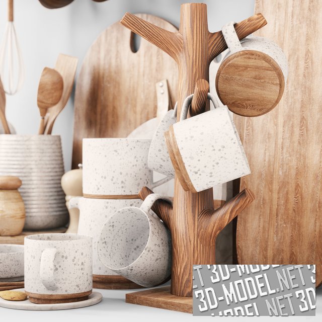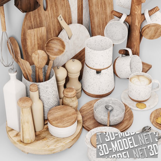 Эстетичный набор из современных кухонных аксессуаров и посуды. Над композицией к стене прикреплена система хранения сыпучих продуктов и специй в виде горизонтальной деревянной коробки с восемью выдвижными ящичками с белыми надписями на фасадах. Под коробкой смонтирован хромированный рейлинг, с висящими на крючках чашками «под дерево». В основной композиции размещены: разделочные доски из дерева и пластика «под белый мрамор», деревянные подставки и тарелки, керамические (белые в серую крапинку и бежевые) чашки, кружки, кофейник, сахарница, емкость с деревянными ложками и лопатками, перечница, солонка, бутылочки для масла и уксуса, венчик.