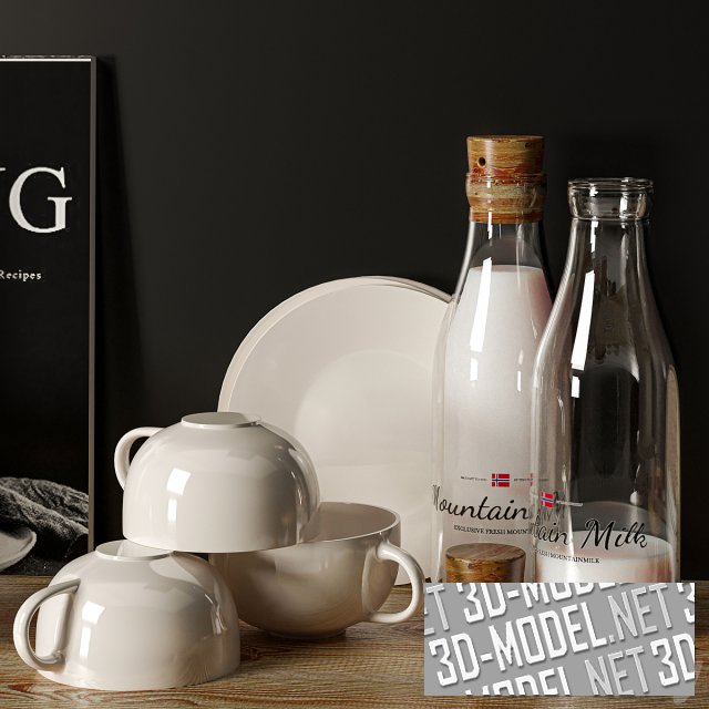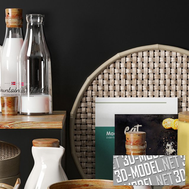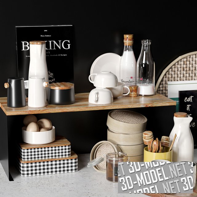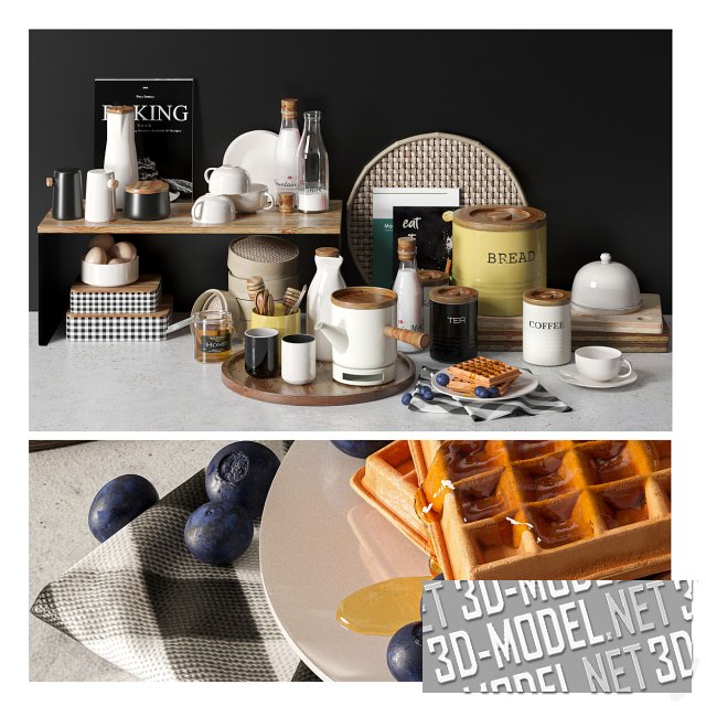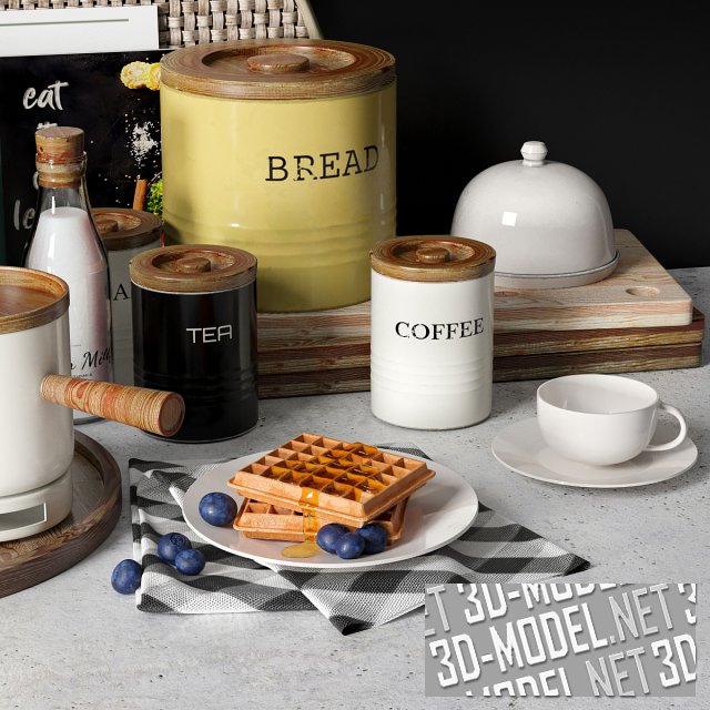 Аппетитный сет с продуктами и посудой для интерьера кухни. На деревянной полке стоит белый молочник и две стеклянные бутылки с молоком. Три большие фарфоровые чашки сияют белизной. На коробках в черно-белую клетку с деревянными крышками стоит белая емкость с яйцами. Тут же деревянный поднос с различной кухонной утварью, банка с медом, вафли на тарелочке, ягоды голубики и чайная посуда.