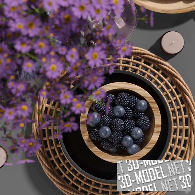 Аппетитная сервировка с ароматом ягод (черники, ежевики, смородины). Часть ягод присутствует в композиции, цвет некоторых элементов тоже "ягодный". Румяные оладьи, напитки, букет цветов создают хорошее настроение доброго утра и вкусного завтрака.