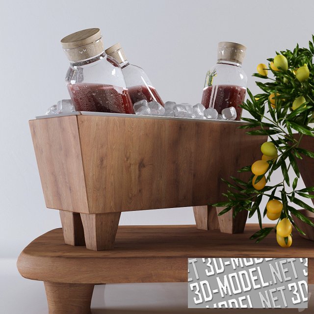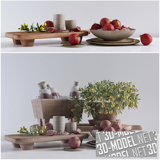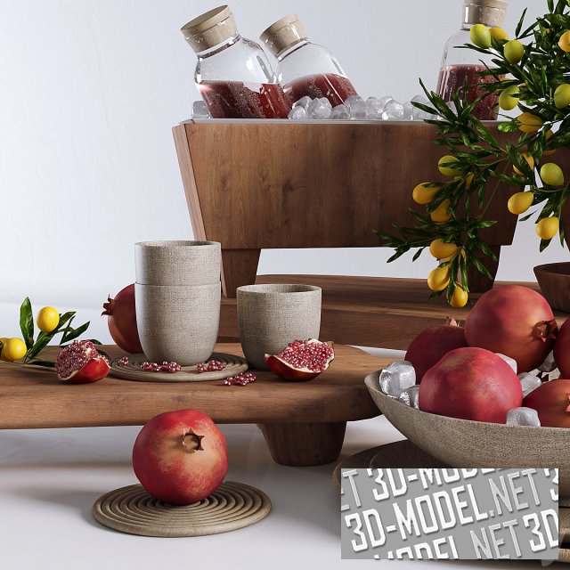 Украсить интерьер кухни и внести в пространство аромат фруктов и теплоту дерева можно с помощью этого набора. Органично собраны в единую композицию предметы посуды (деревянные чаши, подставки и пр.), бутылки с гранатовым соком, чаша с гранатом, чаша с ветками кумквата, поднос для вина со льдом и пр.