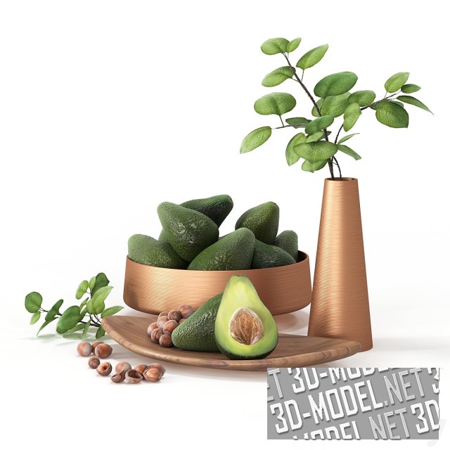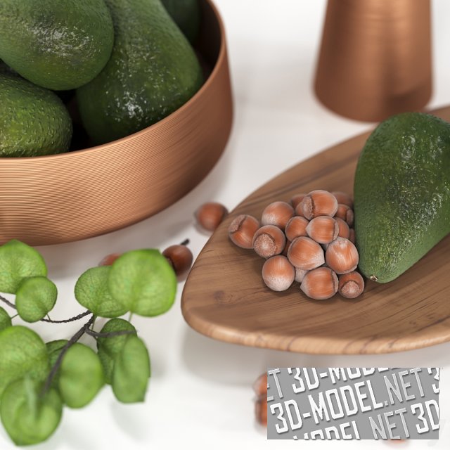 Красивый сет для интерьера кухни. На узком деревянном блюде коричневого цвета лежит целый плод и половинка авокадо и насыпаны орехи фундук. Сочные зеленые плоды авокадо лежат горкой в круглой емкости цвета начищенной меди. Они красиво сочетаются с зеленой веткой, стоящей в вазе такого же цвета. Еще одна ветка с мелкими зелеными листочками и горстка орехов фундук, лежащие на плоскости рядом с блюдом дополняют набор.