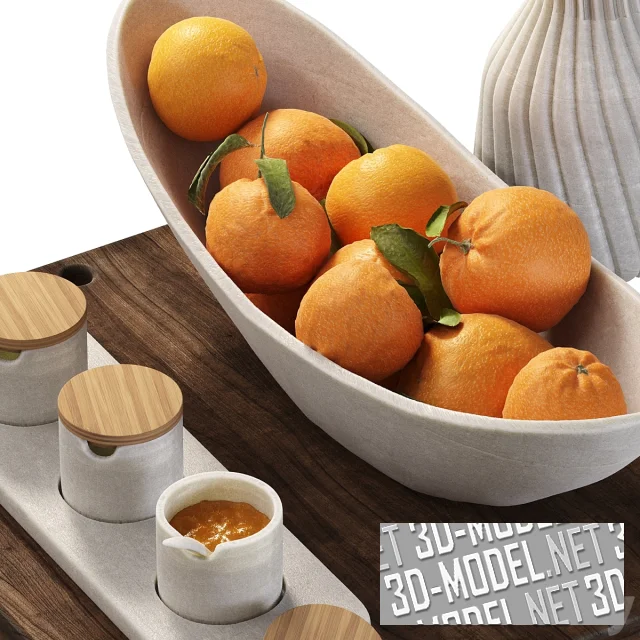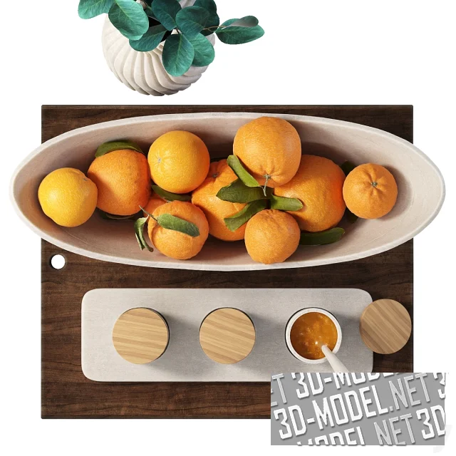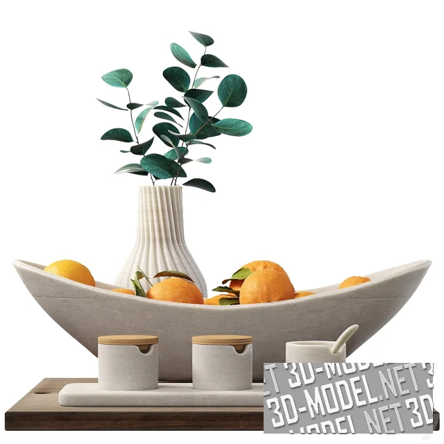 Набор посуды из светлого мрамора и апельсины в блюде. Композиция размещена на прямоугольной разделочной доске из темного дерева. В наборе: изящная ваза с рельефными канавками, блюдо в виде лодки, прямоугольная дощечка с круглыми гнездами, в которых установлены три емкости для специй с деревянными крышками. В вазе - веточки с зелеными листьями. В блюде несколько апельсинов.