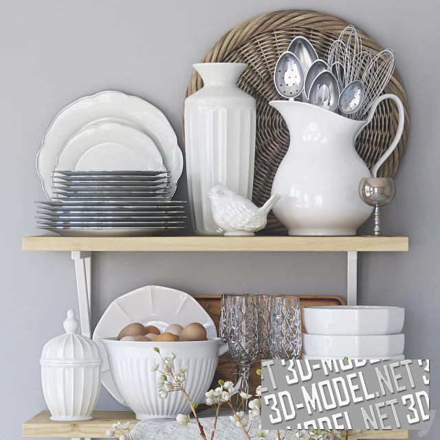 Белая посуда в классическом стиле, кухонные аксессуары и цветущие ветки в стеклянной банке, расставленные на трехъярусном стеллаже с деревянными полками. Кроме белых тарелок нескольких видов, графинов, чашек, кувшинов, сахарниц, на полках размещены: белая фарфоровая птичка, хрустальные бокалы, стеклянный кубок, тканевая салфетка, круглый плетеный и прямоугольный деревянный подносы. В кувшине серебристые ложки, шумовки, венчики. В глубоком большом белом горшке - куриные яйца.