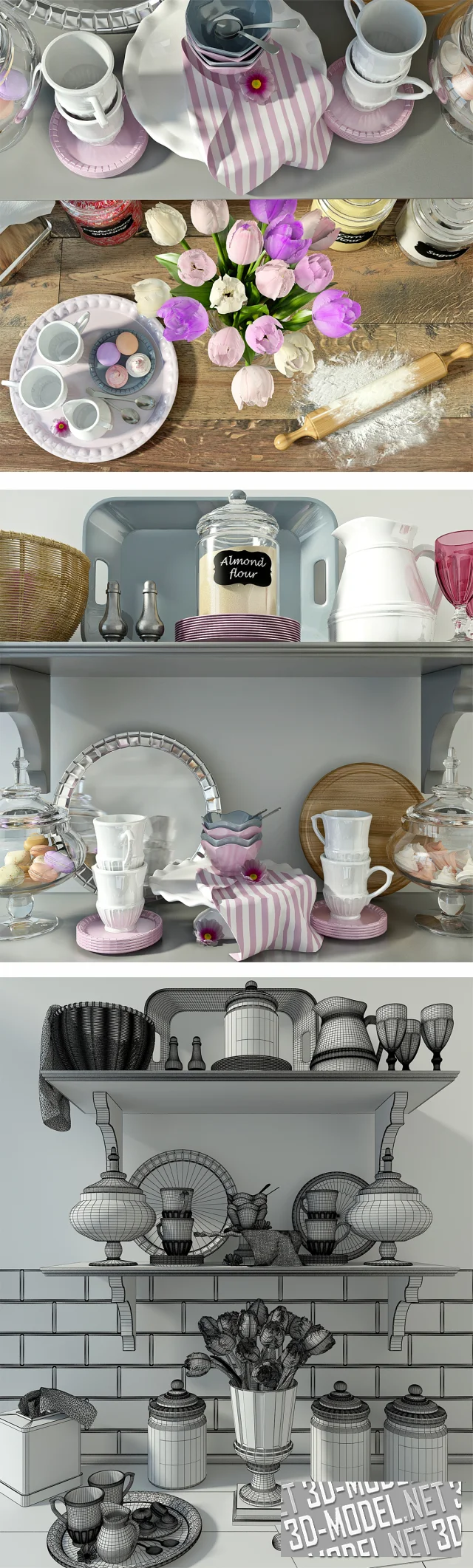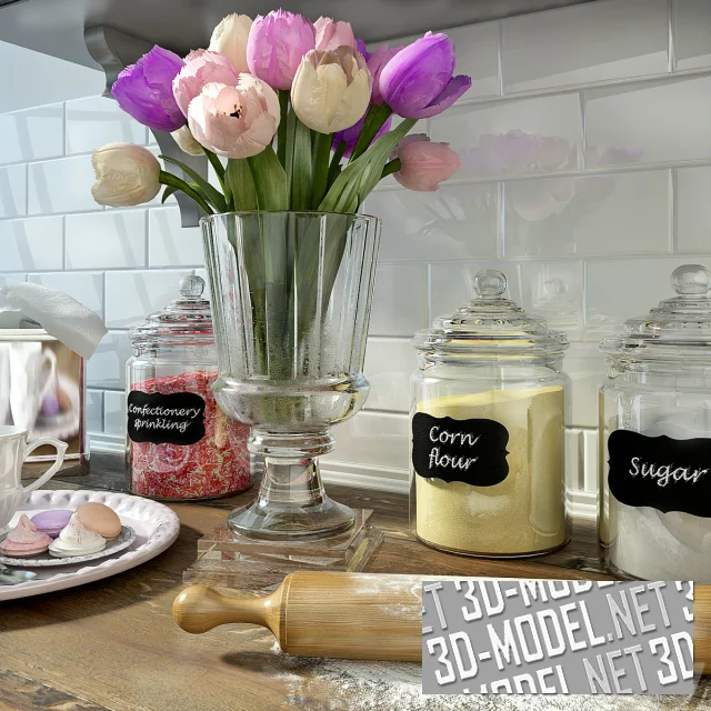 Аксессуары и декор для винтажной кухни. Композиция собрана на двух серых полках с фигурными консолями и дубовой столешнице. На поверхности деревянная скалка на рассыпанной муке, блюдо с чашками и соусником, блюдце с макарунами, полированная металлическая коробка с бумажными салфетками, стеклянные емкости в классическом стиле с сыпучими продуктами, букет тюльпанов в стеклянном кубке. На полках: посуда в классическом стиле, корзина, круглая деревянная разделочная доска, серый лоток, металлические солонка и перечница, тканевая салфетка в сиренево-белую полоску, бокалы из стекла бордового оттенка.