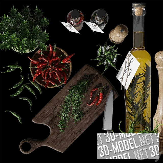 Розмарин и перец чили в декоративной композиции для кухни образуют яркий комплект. Специи показаны в нескольких видах: в прозрачных стеклянных бутылках с растительным маслом, на деревянной разделочной доске, в деревянных и стеклянных мисках. Густой зеленый пучок розмарина растет в зеленом цветочном горшке. Сцена дополнена деревянной ручной мельницей для специй и кухонным разделочным ножом.