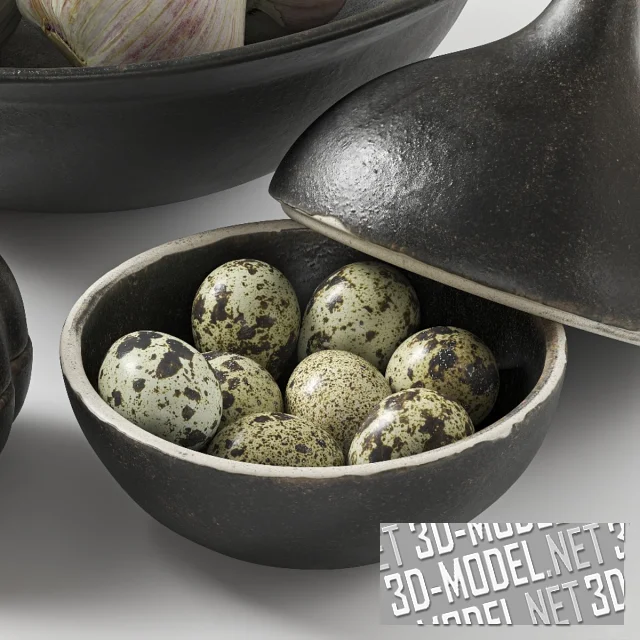 Матовая поверхность посуды ручной работы создает спокойную, природную атмосферу, а натуральные ингредиенты добавляют аутентичный кулинарный штрих. Это сочетание прекрасно подходит для кухонных полок, обеденных столов, композиций на тему еды или натюрмортов в деревенском стиле как в современных, так и в традиционных интерьерах. Архив содержит чашу среднего размера (диаметр 25 см), емкость в форме луковицы (высота 11,5 см) и емкость в форме чеснока, высотой 9 см.