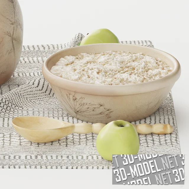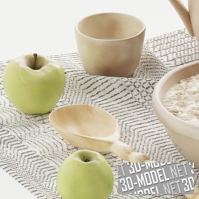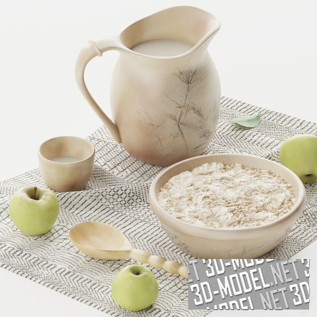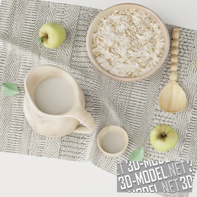 Декоративная композиция в фолк-стиле. Элементы набора собраны на прямоугольной текстильной салфетке с мелкими геометрическими черно-белыми орнаментами. Посуда из светлой керамики (миска с кашей, крынка и стаканчик с молоком) дополнена деревянной ложкой и тремя зелеными яблоками. От композиции веет свежестью и летом. Габарит сета: 39,1х53,1х17см.