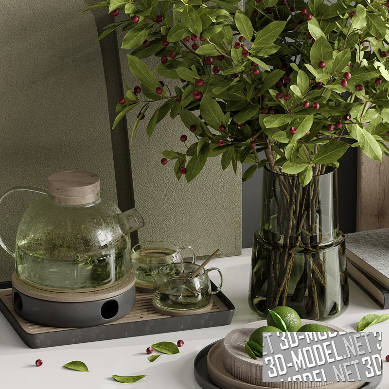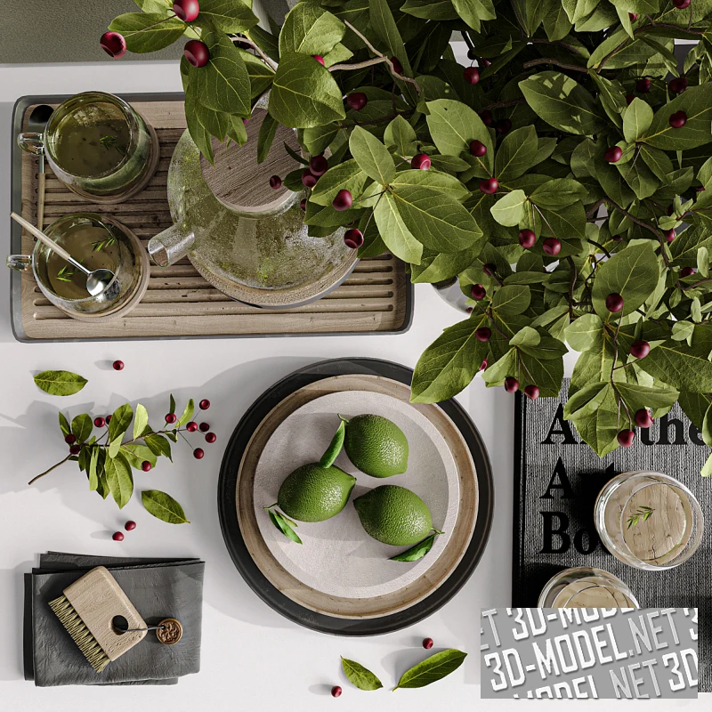 Натюрморт с посудой, продуктами и мешочком зеленого чая