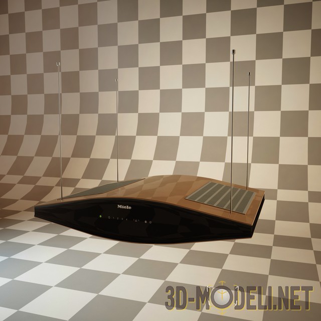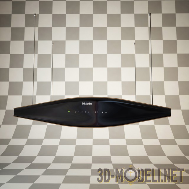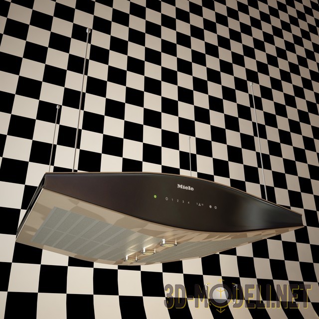 3D модель вытяжки Miele DA 7000 D. Островная декоративная рециркуляционная вытяжка шириной 100 см, для свободного крепления к потолку. Корпус выполнен из черного и белого стекла. Сенсорное управление на стекле предусмотрено со светодиодными индикаторами: освещение панели конфорок, включение-выключение и регулировка мощности, счётчик рабочих часов для определения насыщения жирового фильтра, который программируется индивидуально, остаточный ход мотора (5/15 мин.), программируемое автоматическое отключение интенсивной ступени мощности после 10 мин., а также три ступени мощности плюс интенсивная ступень. Отличная модель для современного интерьера кухни.