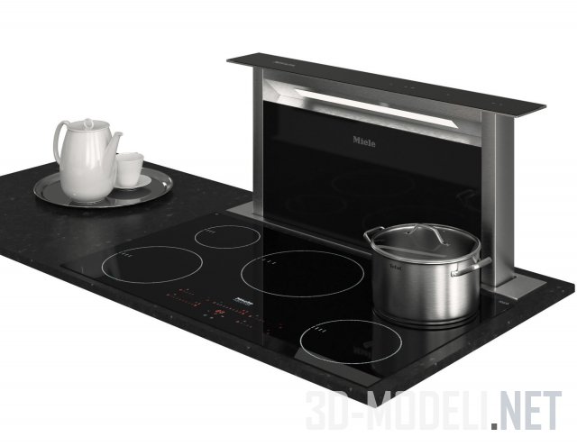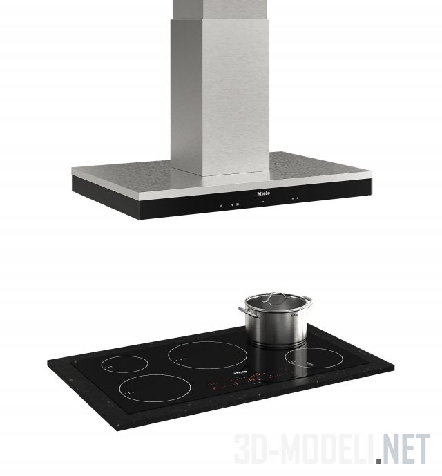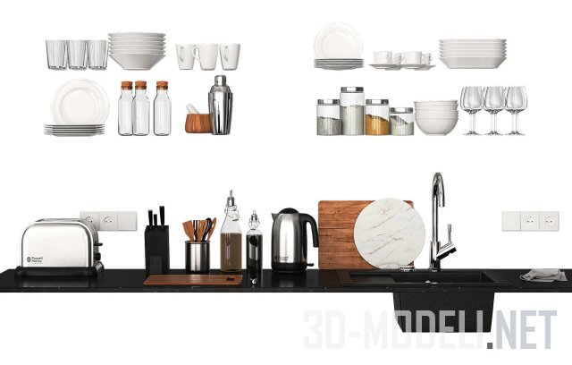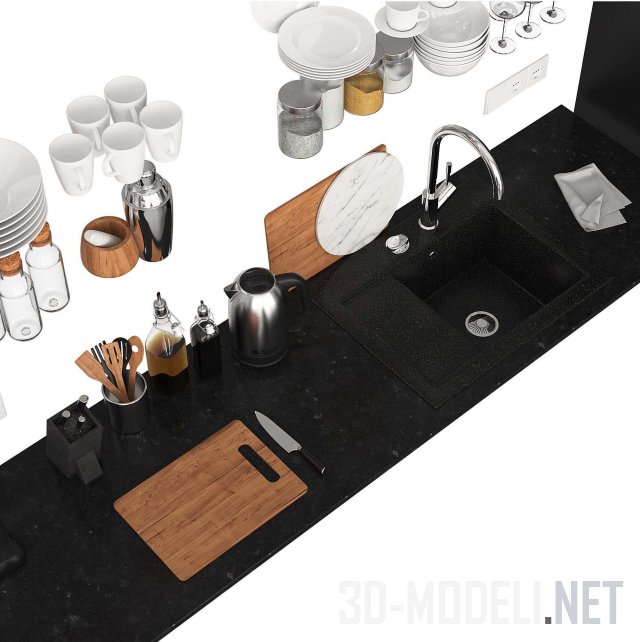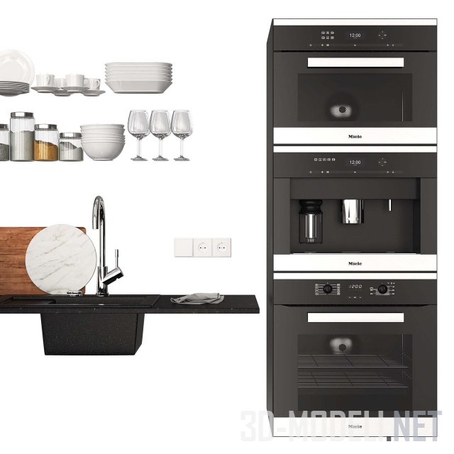 При проектировке и создании интерьера современной кухни будет незаменим этот набор. Включает в себя некоторые элементы кухонной техники от Miele (вытяжки, варочная поверхность, стойка со встроенными духовкой, микроволновкой и кофемашиной), мойка и смеситель от Villeroy&Boch, розетки, посуда белого цвета, разделочные доски, емкости со специями, бокалы, бутылки с маслами.