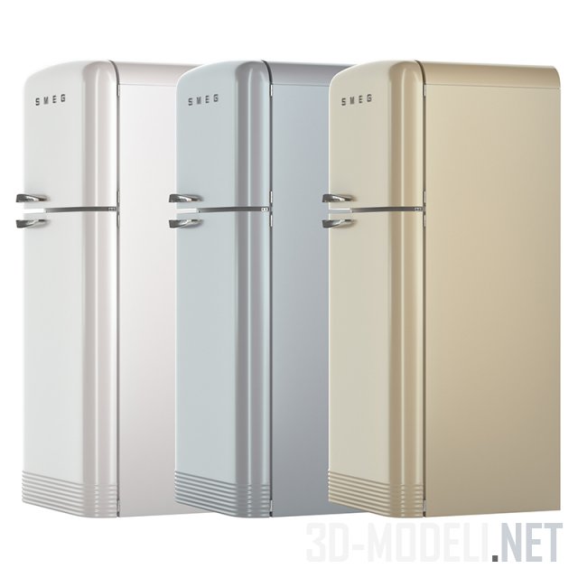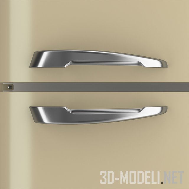 Отдельностоящий двухдверный холодильник, сделанный в стиле 50-х годов с закругленными углами. Модель Smeg FAB50X. Ширина холодильника 80 см. Представлен в трех цветах: серебристый, серый и бежевый. Ручки хромированные.