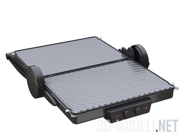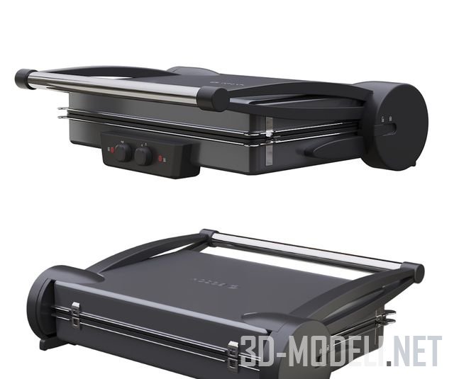 Современный кухонный бытовой прибор, электрогриль Bosch TFB4431V. Корпус прибора выполнен в графитово-серых тонах. На верхней плоскости крышки помещен барельефный логотип «Bosch».