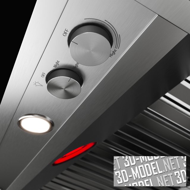 Современная профессиональная кухонная вытяжка Jenn Air JXW9048HP в корпусе серебристого цвета с брашированной отделкой. Зонт монтируется над плитой к стене. Органы управления и подсветка смонтированы на нижней ближней кромке. В нижней плоскости размещены и две инфракрасные лампы для разогрева пищи. Габарит вытяжки: 121,9х63,5х45,7см.
