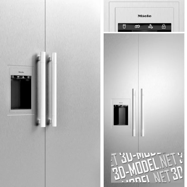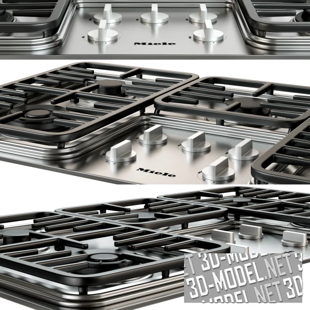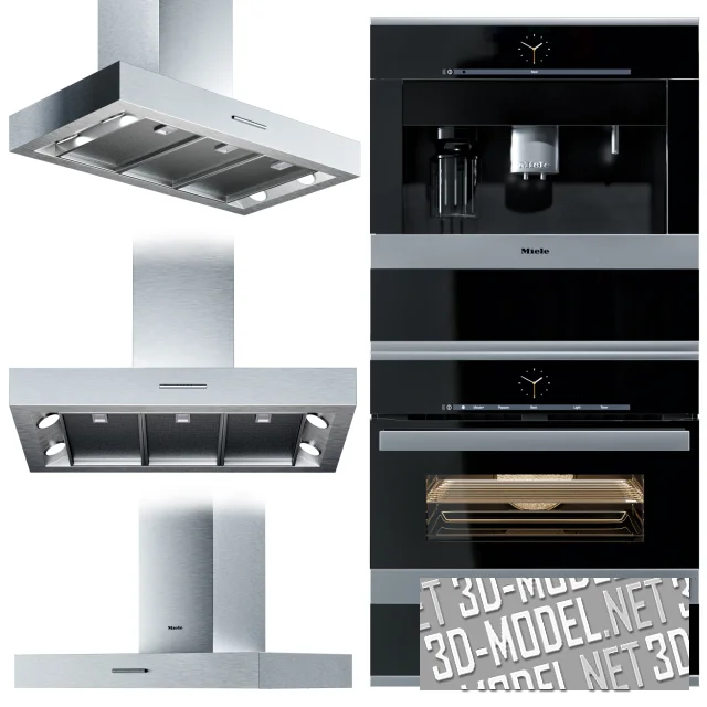 Набор современной кухонной бытовой техники от Miele. В комплекте холодильник Side-by-side, с генератором льда на створке, варочная газовая поверхность на пять конфорок KM 3475 G (91,4см), прямоугольной формы вытяжка (89,8см) с встроенной подсветкой и сенсорным управлением, встраиваемая духовка и кофемашина.