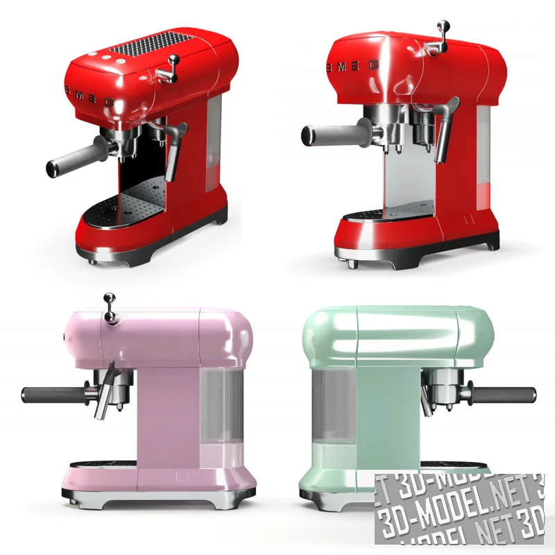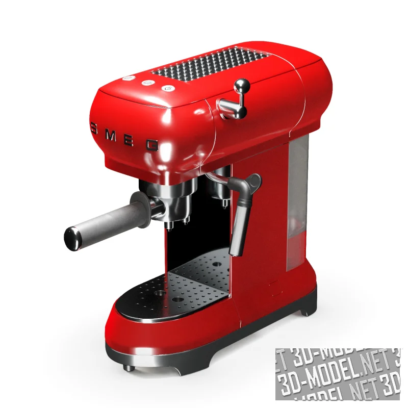 Эспрессо-кофемашина от Smeg выполнена в характерном ретро-стиле с плавными округлыми формами и глянцевым корпусом, который сразу притягивает внимание. Компактные размеры позволяют разместить прибор как на кухонной столешнице, так и в кофейной зоне студии, офиса или кафе. Металлический портафильтр, аккуратная каплесборная решетка и удобный рычаг управления подчеркивают ориентированность на ручной процесс приготовления кофе. Машина рассчитана на приготовление насыщенного эспрессо, подходит для использования молотого кофе и легко вписывается в повседневный ритм благодаря простой и понятной конструкции. Цветовая палитра представлена в нескольких вариантах – насыщенном красном, нежном розовом и мягком пастельно-мятном. Каждый оттенок задает своё настроение: красный делает акцент и добавляет динамики интерьеру, розовый создает легкий декоративный акцент с ощущением уюта, а мятный выглядит спокойно и свежо, хорошо сочетаясь со светлыми и скандинавскими интерьерами. Глянцевая поверхность корпуса отражает свет и подчеркивает форму, делая кофемашину выразительным элементом пространства даже без дополнительного декора. Реалистично выполненная 3D модель, созданная с учетом основных характеристик оригинального продукта.
