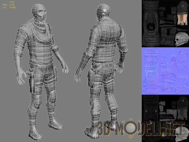 Великолепная low-poly 3D-модель опытного и бесстрашного наемника, изготовленная Дмитрием по артам из литературного произведения «Разорванное время» за авторством А.Калугина. Грамотное использование полигонов (трехмерный каркас содержит всего лишь 5,34 тыс. треугольников, что по современным меркам совсем немного), множество мелких деталей, корректная постановка освещения, реалистичные текстуры высокого разрешения, полное отсутствие грубых ошибок. Выражаясь казенным языком, уровень качества соответствует самым строгим запросам. По нашему мнению, данный трехмерный «герой» найдет достойное применение в любом современном экшене, например в Crysis.