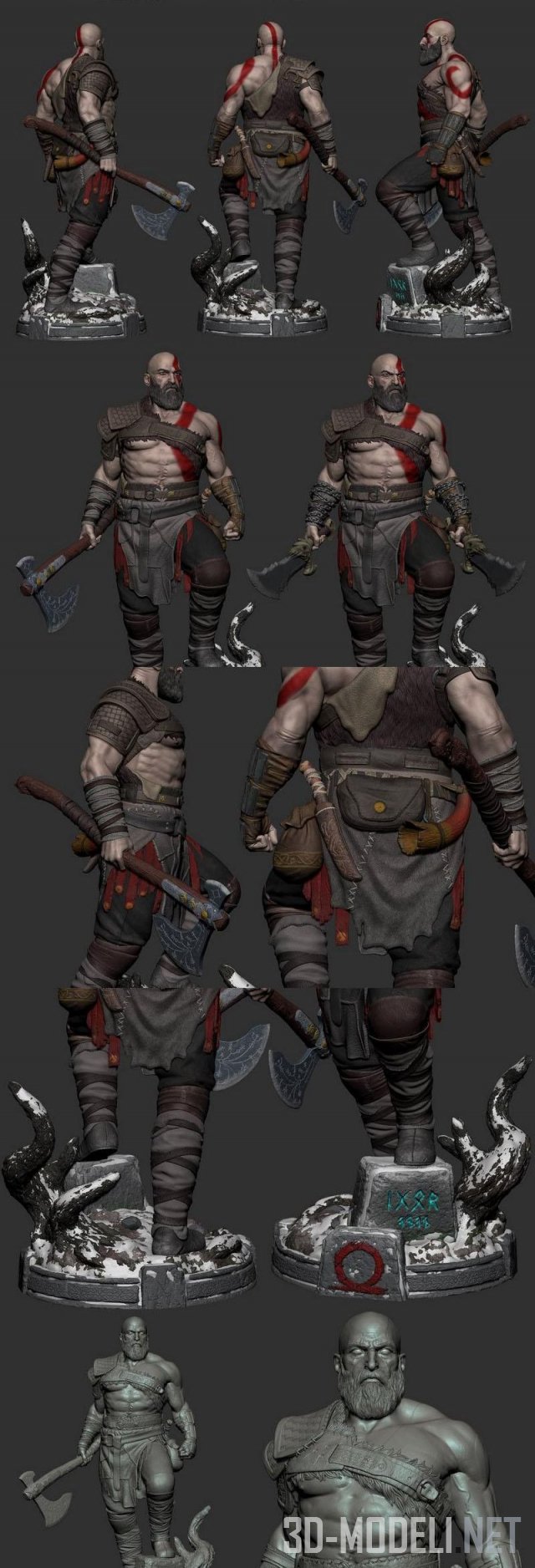 Игровой персонаж из God of War, мускулистый мужчина Kratos. Он изображен с наголо обритой головой, кожей пепельного цвета и красными татуировками на теле. Основным, любимым оружием Кратоса являются короткие мечи, но в God of War 2018 года — боевой топор. Именно с топором представлена модель, готовая к 3d-печати.