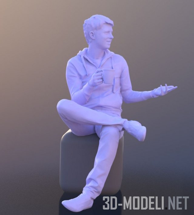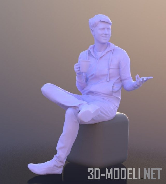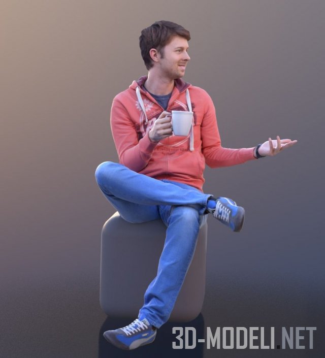 Реалистичная 3D-Scan модель молодого мужчины по имени Джон. Мужчина сидит с кружкой и общается.