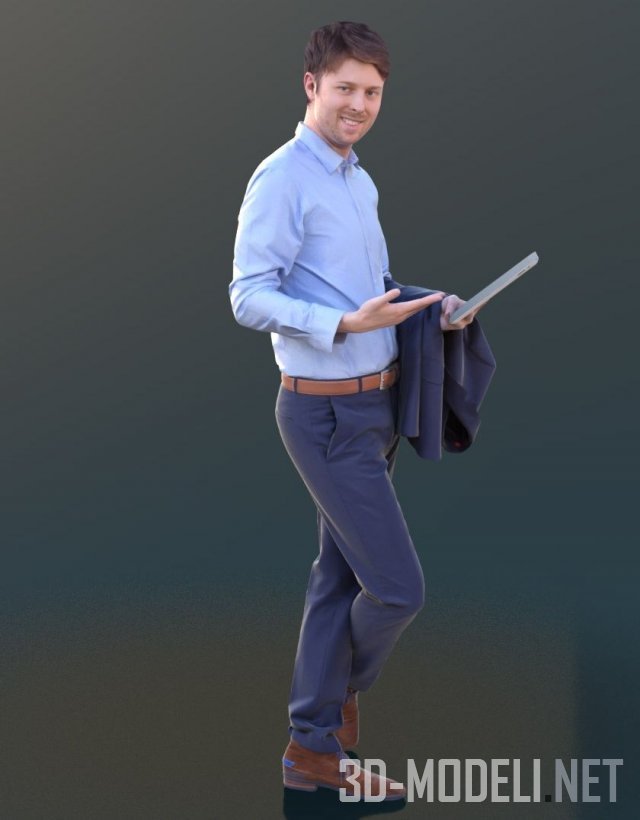 Трехмерная 3D-Scan модель Business man John stands with iPad – молодой мужчина по имени Джон. Джон бизнесмен, об этом говорит его одежда, уверенность и iPad в руках. Текстуры собраны в архиве.