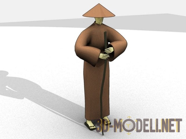 Простенькая low-poly 3d модель (объект содержит порядка 5 тыс. полигонов или 10 тыс. треугольников) монаха с посохом. Модель персонажа насажена на так называемый скелет или бипед и полностью готова к дальнейшей анимации. На создание данной работы у автора ушло около 5 часов.