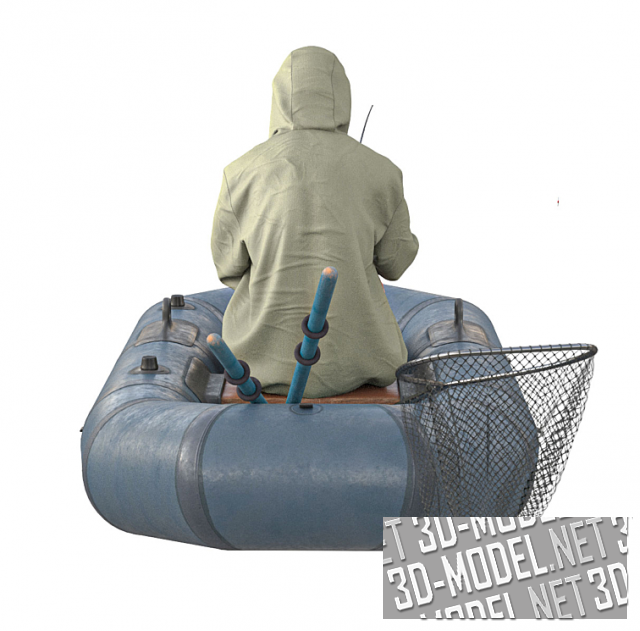 Мужская фигура в резиновых черных сапогах, камуфлированых штанах, и брезентовом плаще, сидящий в синей надувной резиновой одноместной лодке. Пара весел, сачок для рыбы с телескопической рукоятью и черная телескопическая удочка размещены в лодке. Сидящий на дощатой лавке рыбак сосредоточен на удочке.