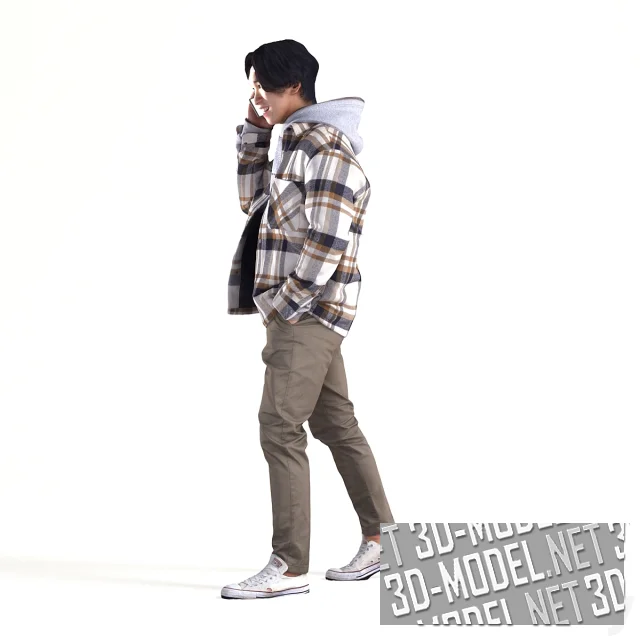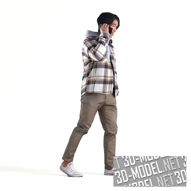 Молодой темноглазый парень Крис (Chris), с темными волосами средней длины, идущий с телефоном в поднятой к уху руке. На парне светло-серый худи под теплой клетчатой серо-бело-охристой рубашкой. Брюки темно-песочного цвета и потертые низкие белые кеды завершают образ.