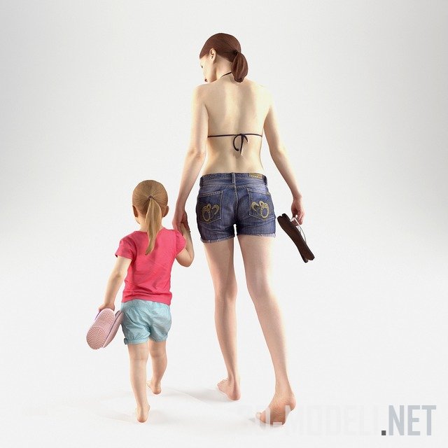 Трехмерная модель сканированных персонажей: молодая женщина, идущая босиком, за руку с ребенком (дочкой). 3d-модель выглядит очень реалистично, в комплекте текстура с UV разверткой и карта нормалей.