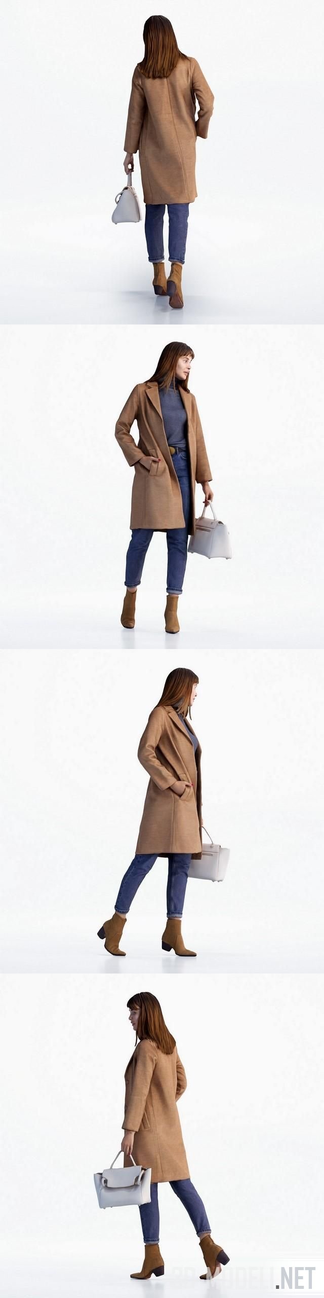 Трехмерная модель в формате 3D scan: молодая женщина по имени Марина. Одета в джинсы и гольф, с цветом которых отлично сочетаются обувь и пальто. Белая сумка вносит свежую нотку в образ.