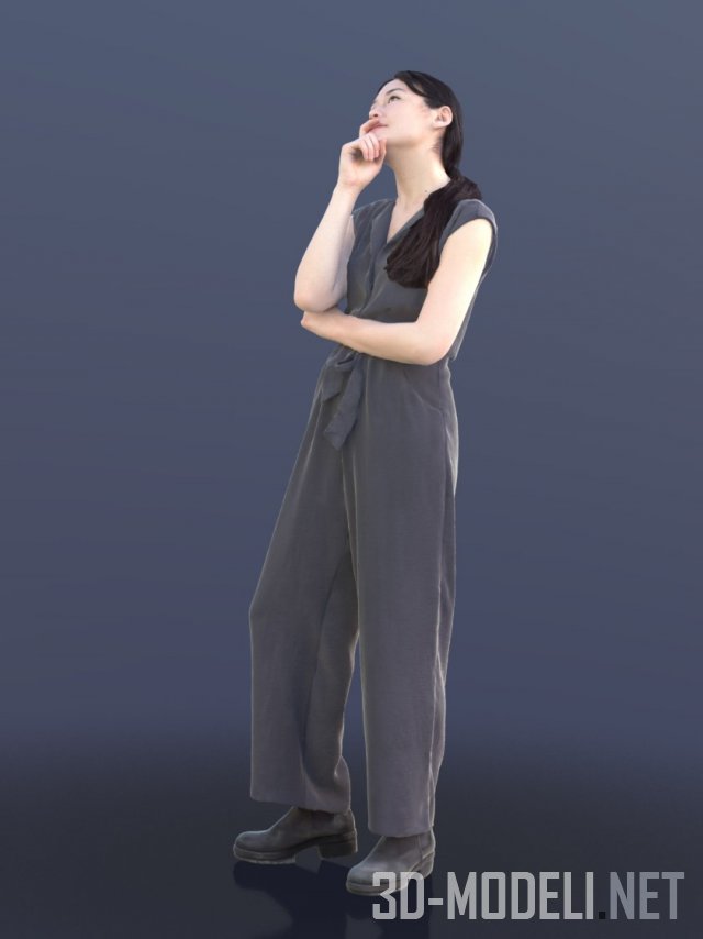 3D-Scan модель очаровательной молодой девушки по имени Франсин. На ней надет комбинезон из мягкой ткани серого цвета и серые ботинки на толстой подошве. Девушка стоит в задумчивой позе, подняв лицо кверху. Длинные черные волосы перекинуты через левое плечо на грудь.