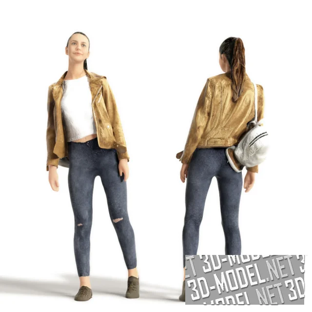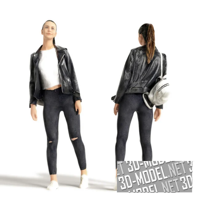 Темноволосая молодая стройная девушка Kira, запечатленная в момент начала движения. На девушке футболка, куртка-«косуха» и леггинсы с живописными дырками на коленях. На ногах кроссовки. На плече висит небольшой рюкзак. Волосы девушки собраны в «хвост» на затылке.