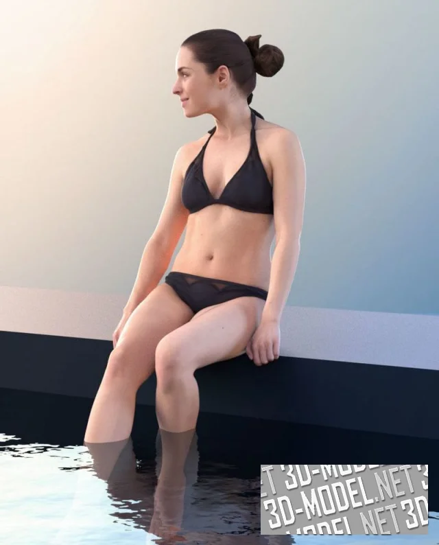 Сидящая на краю площадки девушка в темном раздельном купальнике, опустившая ноги в воду. Образ передает спокойную, естественную позу отдыха: корпус слегка развернут, руки свободно опущены, взгляд направлен в сторону. У модели аккуратные черты лица, собранные волосы и нейтральное выражение, что делает ее подходящей для самых разных трехмерных сцен – от пляжных и курортных композиций до рекламных или художественных визуализаций. Освещение мягкое, а отражения в воде подчеркивают реалистичность.