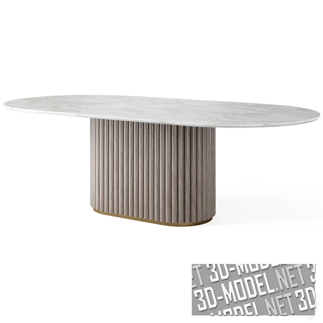 Стол выполнен в изящных пропорциях – его размер 2400x1200x750 мм. Основание представляет собой вертикальные деревянные ламели, собранные в овальную колонну с аккуратным основанием из латуни, а столешница из светлого камня с мягким мраморным рисунком подчеркивает премиальность и чистоту линий.