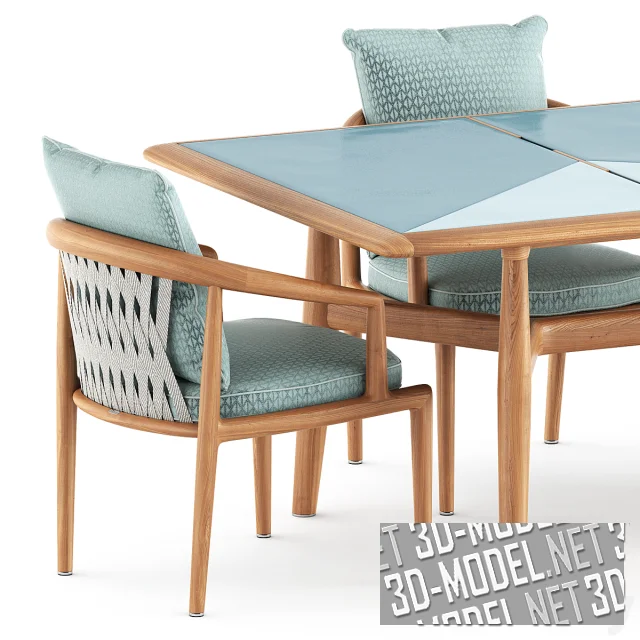 Roberto Lazzeroni). Столешница набрана из трапеций и треугольников в бледно бирюзовых тонах. В этих же цветах выполнена обивка мягких элементов спинки и сиденья стула, а также решетка из текстильных ремней, заполняющая плоскость спинки. Габарит стула: 63х65х72см. Габарит стола: 260х110х75см.