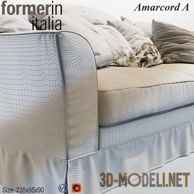 Диван в классическом стиле, производство фабрики Formerin, Италия, модель Amarcord. Основу составляет деревянный каркас с тканевой обивкой, внутренняя набивка подушек сделана из гусиного пуха с добавкой пенополиуритана высокой прочности. Размеры дивана: 235 x 95 x 90 см