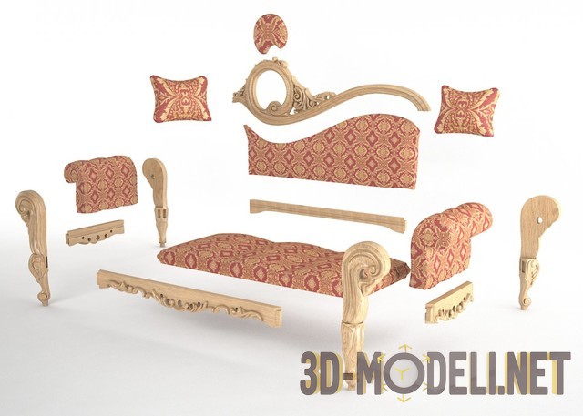 Софа в стиле рококо, в классический интерьер помещения. Имеет обильный резной орнамент из массива дерева в обрамлении спинки, подлокотников, основания и на ногах. Мягкая обивка софы и подушек из текстиля двух видов. Оба в сочетании двух цветов в дамасском орнаменте, бледно-карминного и палевого, повторяющего цвет светлой дубовой древесины на резных деталях корпуса. Модель выполнена в формате, предназначенном для изготовления на цифровых фрезеровочных станках. Все элементы находятся в отдельных файлах, что удобно для изготовления. Также можно использовать для создания сцен визуализации. Формат STL готов для печати или для программы ArtCAM.