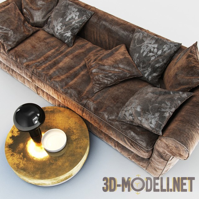 Роскошный кожаный диван Baxter Alfred Soft. Мягкий и комфортный, элегантный и стильный, с выразительными, плавными линиями, этот диван станет центром отдыха в любом пространстве. Комплект дополняет журнальный стол и декор: ваза, подушки, настольная лампа.