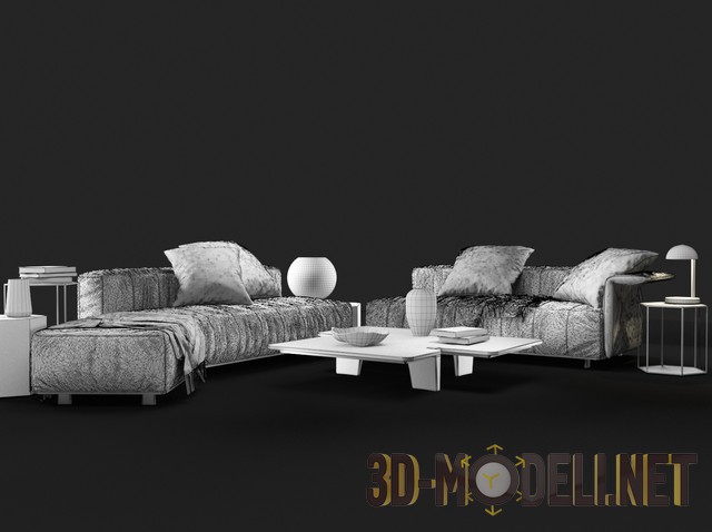 Угловой диван в современном стиле, Lounge Freeman от бренда Minotti. Уменьшенная глубина сидений дает дивану необходимую пространственную гибкость, позволяющую легко размещать его в жилых помещениях ограниченного масштаба, а также в гостиничных помещениях: это залы ожидания, стойки регистрации и корпоративные офисы. Цельные сиденья отличаются декоративной строчкой, которая определяет однородный графический мотив. Различные кусочки обивки собираются с использованием полосы из эко-кожи и двойных швов, что позволяет придать четкое ощущение глубины. Мебель дополнена множеством живописных элементов. Это подушки, плед, ваза на журнальном столике, а также различный декор.