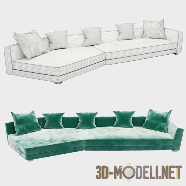 Большая, низкая, мягкая софа. Состоит из двух секций. Одна прямоугольная, вторая пятиугольная, сопрягающаяся с первой своей короткой стороной. Спинка низкая. Комфорт обеспечивают пять подушек. Всё обтянуто зеленовато-белой мягкой тканой обивкой.