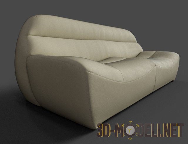 Большой двухместный современный диван. Обивка сплошная, цвета слоновой кости. Два посадочных места имеют эргономичную форму со слегка приподнятыми подлокотниками. Невысокая спинка разделена на две горизонтальные мягкие части.
