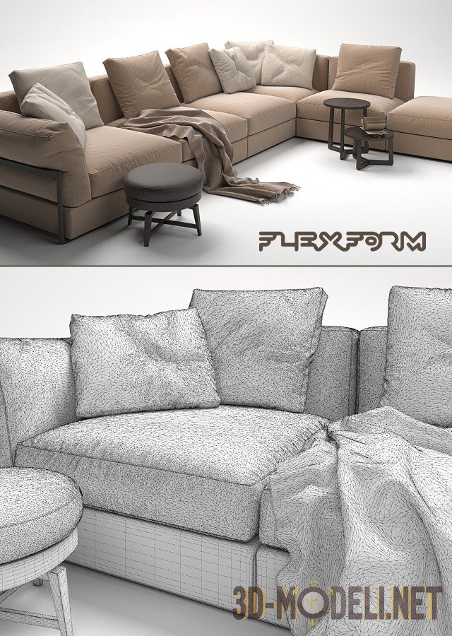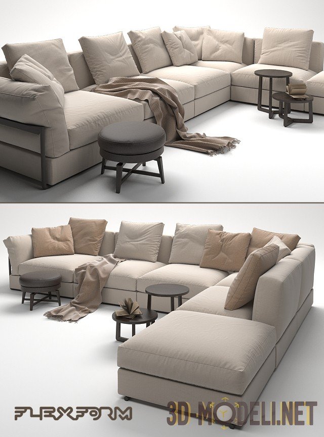Диван углового типа, выполнен в современном стиле, ZENO от бренда Flexform. Размеры дивана: 384 х 284 х 68 см. Диван удачно дополнен двумя столиками Jiff Flexform (40 х 46 см и 40 х 26 см), пуфом Feel Good Flexform (50 х 36 см), а также другими аксессуарами и деталями интерьера, среди которых плед, книги и пр. В архиве присутствует два варианта цвета для обивки дивана.