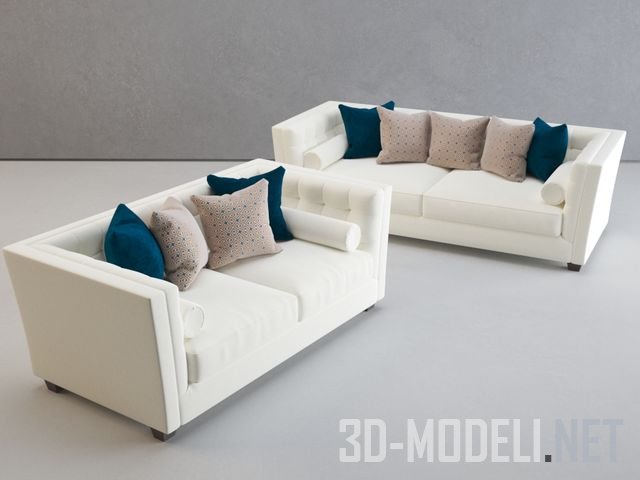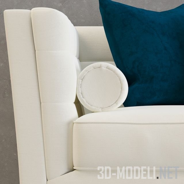 Красивый и стильный диван от Sala Loretto, с обивкой белого цвета, с маленькими коричневыми ножками. К спинке дивана прислонены бежевые с узором и сине-бирюзовые декоративные подушки.