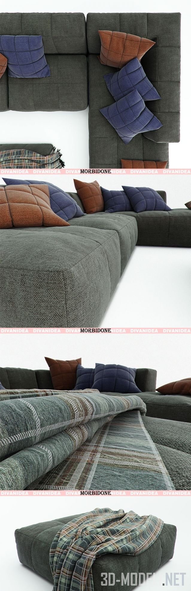 Угловой современный модульный диван MORBIDONE от Divanidea. Диван с мягкой серой обивкой. Поверхность этого минималистичного дивана декорирована квадратными простроченными элементами. Красно-коричневые и синие диванные подушки тоже выполнены с использованием квадратной прострочки. На мягкую подставку для ног наброшен клетчатый плед.