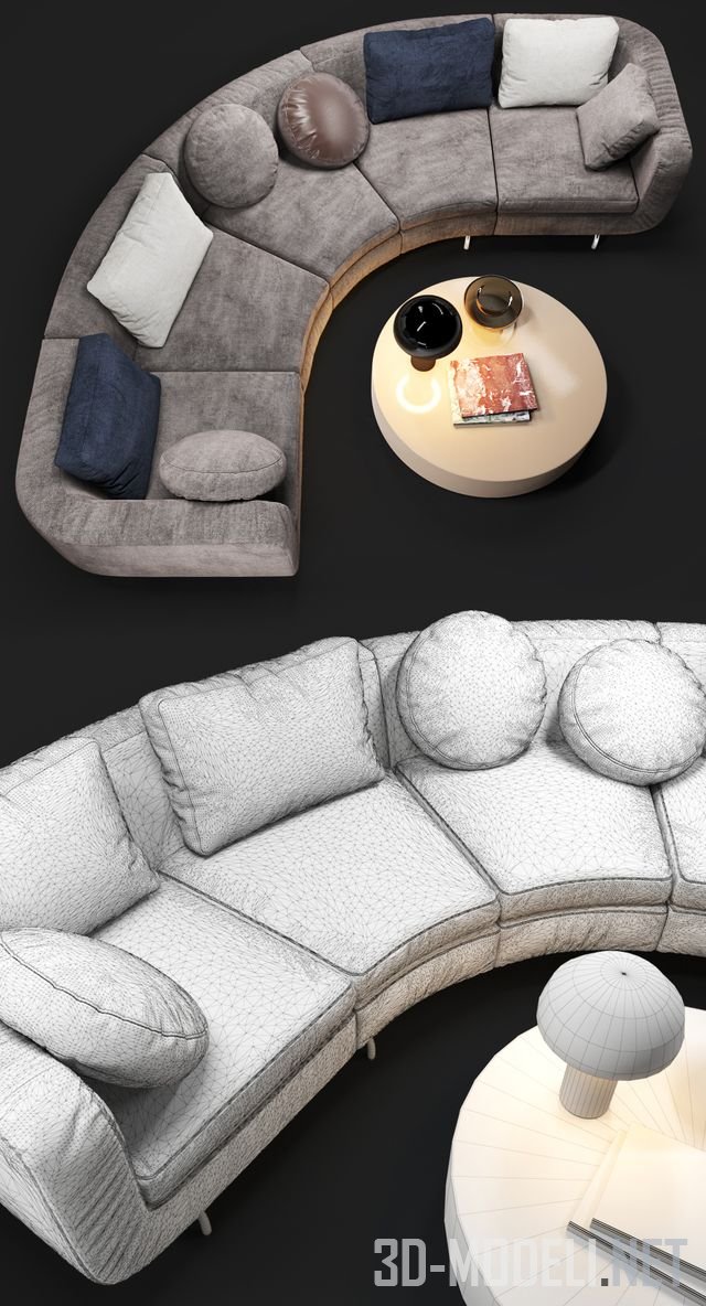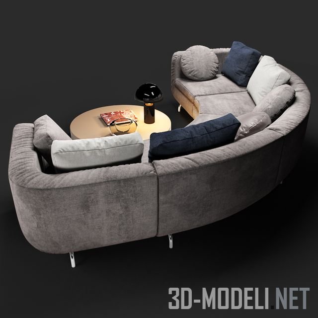 Набор мебели для современной гостиной, с диваном Dubuffet от Minotti и круглым столиком в виде глянцевой бежевой шайбы. Диван пятиместный, слегка закругляется, образуя с круглым столиком гармоничное уютное место для отдыха. Плавные линии подлокотников, низкая спинка, несколько видов диванных подушек разной формы и цвета - круглые и прямоугольные, коричневого, пепельного, синего и светло-серого цвета. Обивка дивана - пепельная. На кофейном столике - современный светильник, ваза из коричневого стекла и пара альбомов.