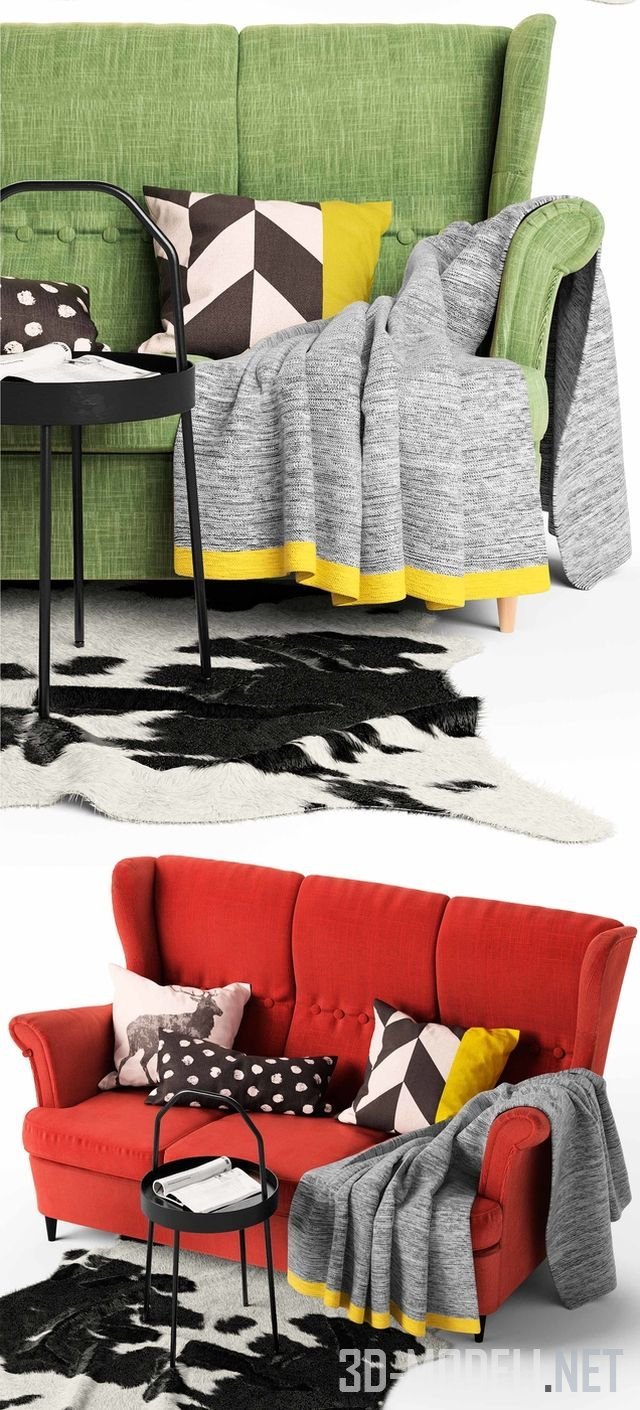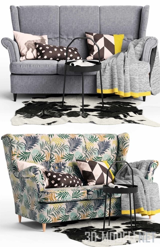 Небольшой диван в традиционном стиле, с высокой спинкой и небольшими подлокотниками. Модель Strandmon от бренда IKEA, представлена в пяти вариантах обивки: желтый, красный, серый, зеленый, растительный узор. Размер дивана: 171 х 92 х 100 см. Модель дополняют: ковер KOLDBY из коровьей черно-белой шкуры, серый плед с желтой каймой, подушки с декоративными чехлами в черно-белых тонах и круглый черный журнальный столик на четырех металлических ножках.