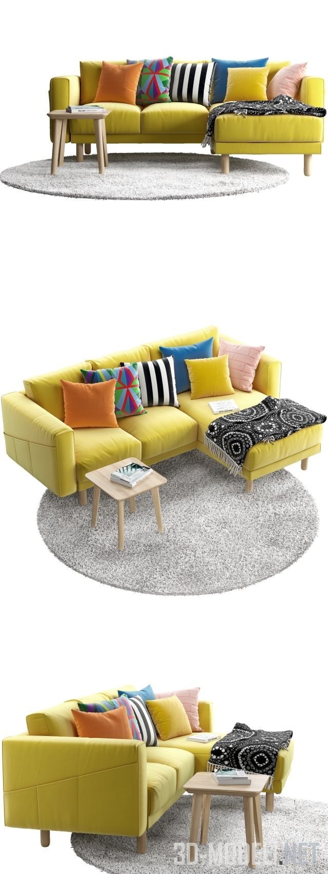 Набор пестрой мебели от IKEA. На круглом длинноворсовом коврике серого цвета (диаметр ковра 2200 мм) установлен небольшой угловой диван грязно-лаймового цвета, модель Norsborg, а также табурет Lisabo. На сиденьях дивана в большом колличестве разложены диванные подушки в чехлах с пестрыми принтами и плед. Габарит дивана: 2310 х 1570 (880) х 860 мм.
