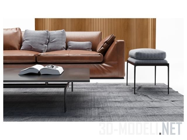 Модульный современный диван Richard от B&B Italia, проедставлен в двух модификациях: угловой и прямой двухместный, с светло-серой тканевой и коричневой кожаной обивкой. Перед диваном расположился прямоугольный журнальный стол Diesis на металлическом основании. Столешница - матовая, черная, мраморная. Пуф Mirto Indoor c книгами и аксессуарами, пуф FRANK, кофейные столики Michel из металла и черного стекла, две небольшие кожаные табуретки с круглыми сиденьями на хромированных ножках. Композиция выстроена с декоративной рифленой изогнутой поверхностью высокой ширмой на заднем плане и с большим серым ковром на полу.