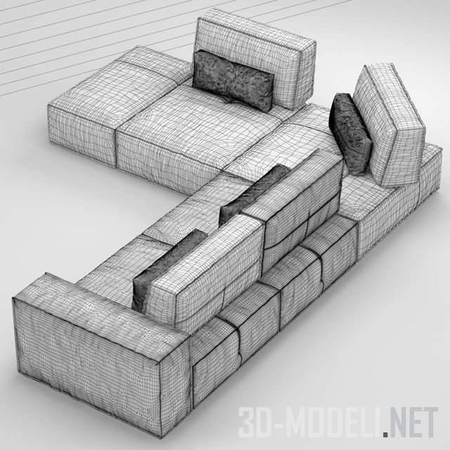 Угловой современный диван с серо-синей обивкой, модель Soho от Gamma. Система, отодвигающая спинки назад, позволяет изменять глубину сидений с 66 до 106 см. Высота сиденья - 42 см. Подлокотник: 30 см шириной и 59 см высотой. База смонтирована на 8-мисантиметровых деревянных ножках.